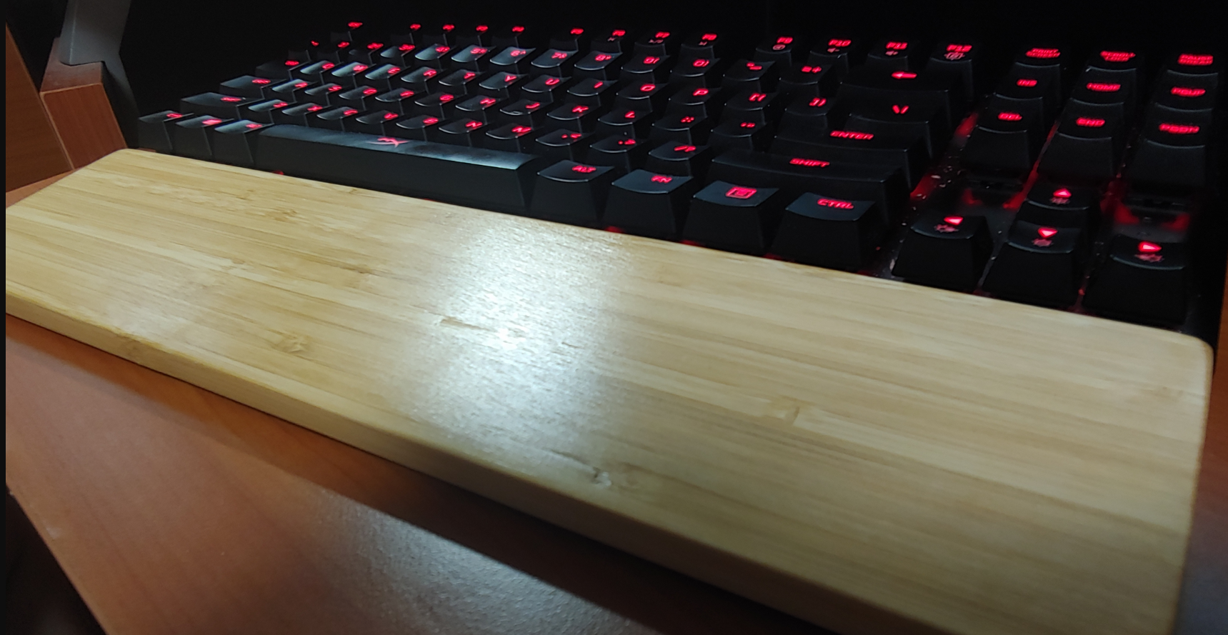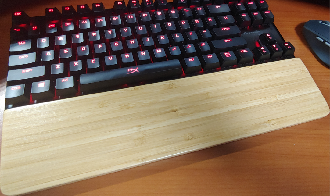 기계식 키보드를 사용하는 사람들은 필수로 보입니다. 여러 제품이 나와있지만 대나무 제품을 선택한 것은 음료수나 물을 흘려도 닦기 편해서 입니다. 깨끗하게 유지할 수 있죠. 또 항상 손을 대고 있어야 하는데 아무래도 합성 플라스틱 보다는 대나무가 좀 안전하게 느껴집니다. 니스칠이 되어 있어서 은은한 광택이 나고 부드러운 느낌입니다. 나무 제품이라 거칠까봐 걱정했는데 오버였네요 ;;;